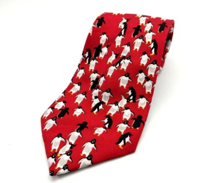 Our waddling penguins silk tie is a real eye catcher as dozens of frolicking Adelie penguins waddle over a brilliant 100% silk red fabric, making this a wonderfully attractive and cool formal penguin accessory. The tie is of standard for ties, 3.5" in width x 57" in length.